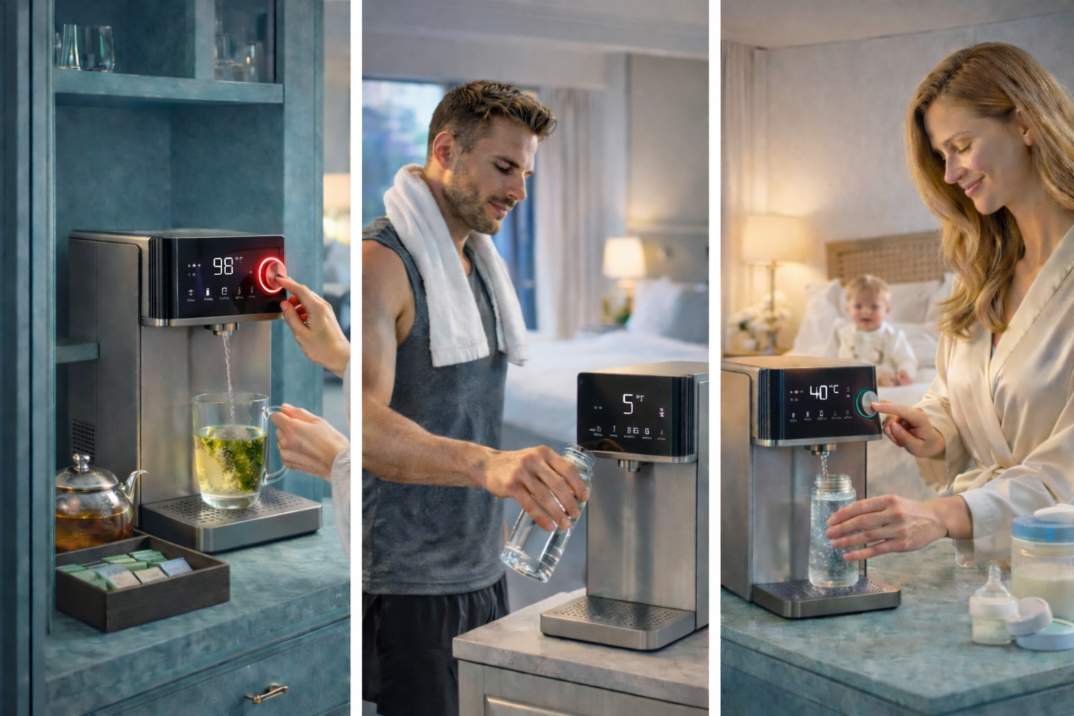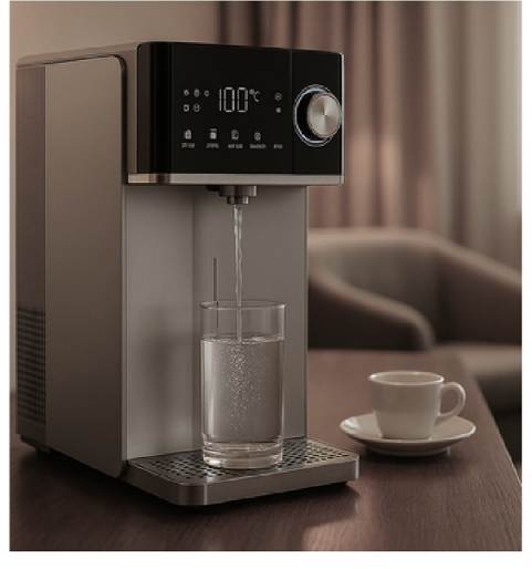 El huésped selecciona la temperatura exacta y disfruta de agua purificada ideal para infusiones o bebidas calientes.